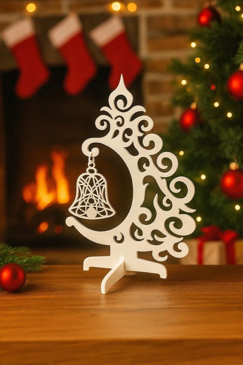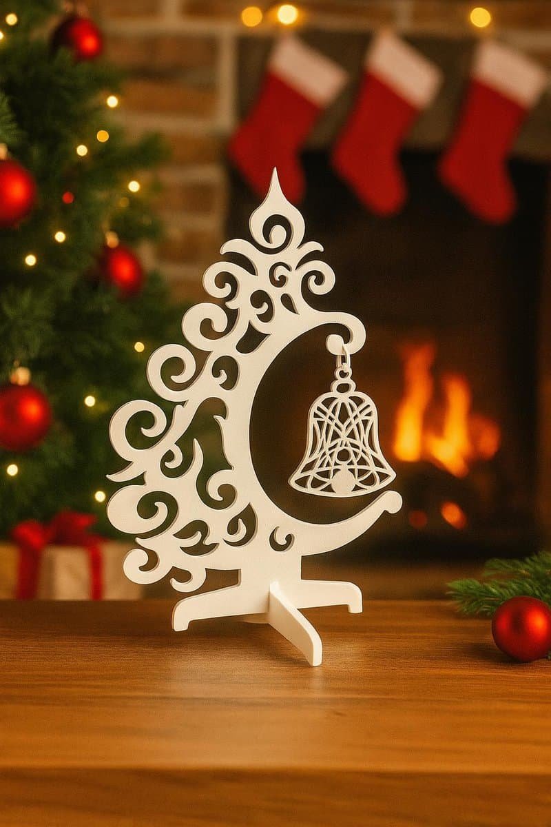 Decoratiune de masa premium tip bradut cu clopotel, realizata din acril alb premium, decupata cu laser de inalta precizie pentru un aspect impecabil si detalii perfect conturate.