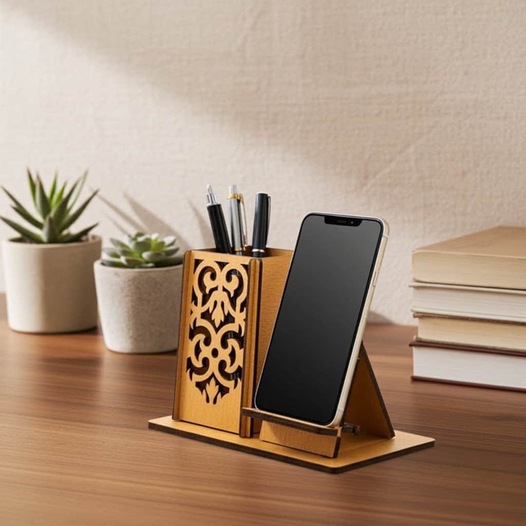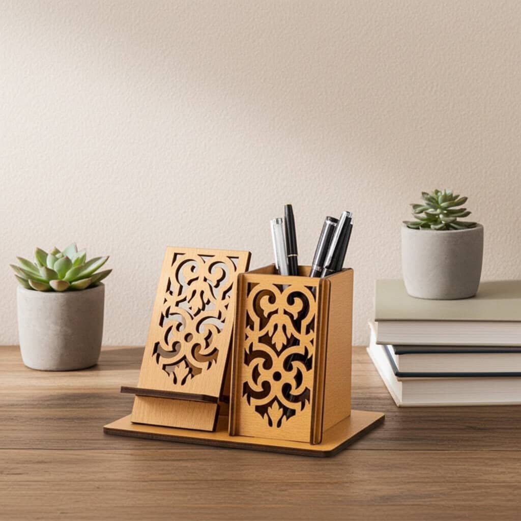 Adauga un plus de rafinament si organizare spatiului tau de lucru cu un suport birou din lemn decupat cu laser. Creat cu precizie si atentie la detalii, acest accesoriu combina estetica naturala a lemnului cu functionalitatea necesara pentru un birou ordonat.