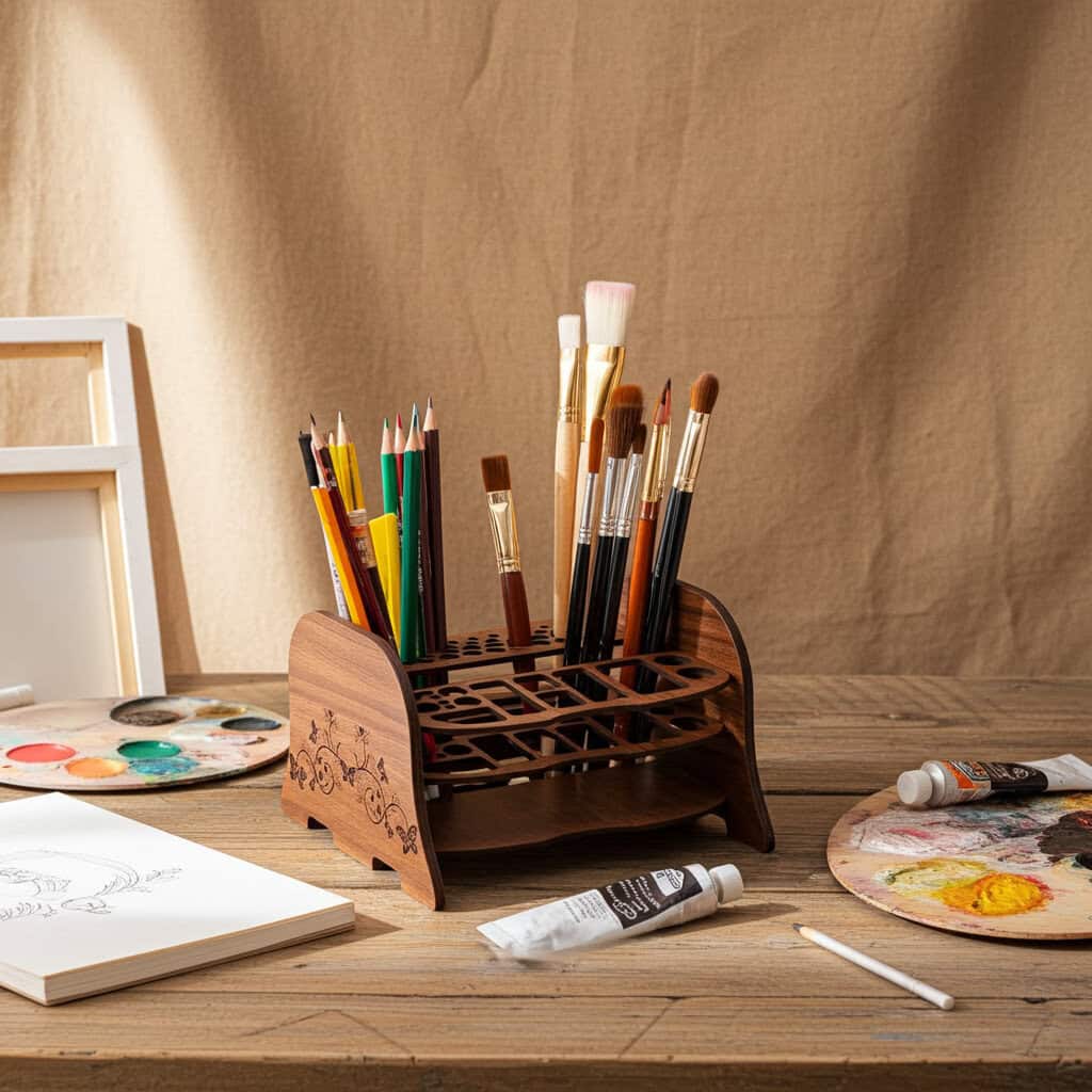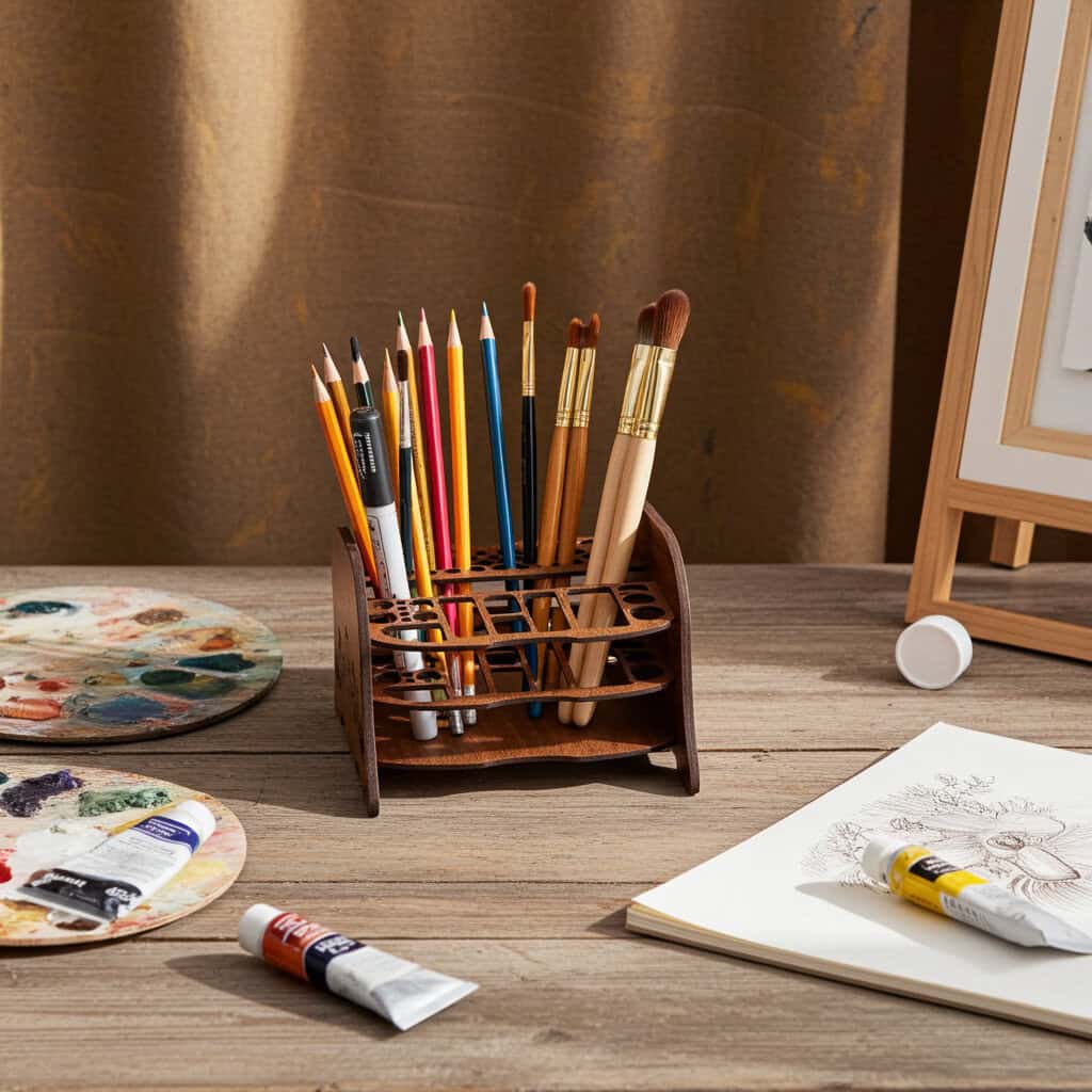 Un suport de pensule din lemn decupat cu laser este un accesoriu elegant și practic, destinat artiștilor, pasionaților de pictură sau profesioniștilor din domeniul machiajului. Acesta combină precizia tehnologiei laser cu frumusețea naturală a lemnului, rezultând un obiect durabil, estetic și funcțional.